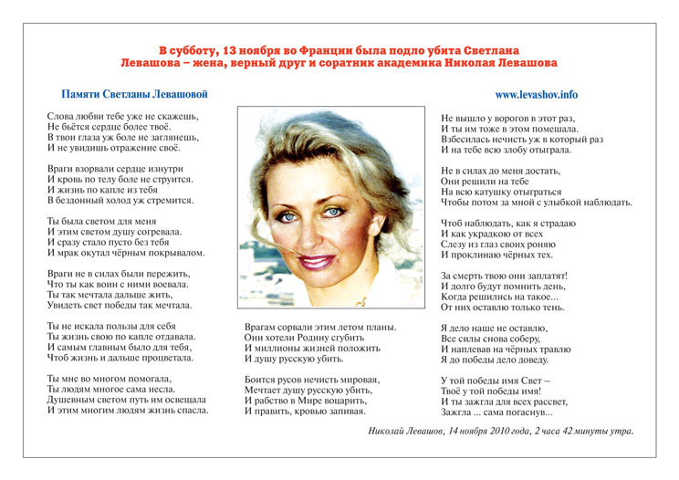 Светлана Левашова В субботу 13 ноября 2010 года во Франции была подло убита Светлана Левашова – жена, верный друг и соратник академика Николая Левашова. Очень больно, когда ничтожества ухитряются убивать умных и добрых людей, служащих идеалом для всех остальных…